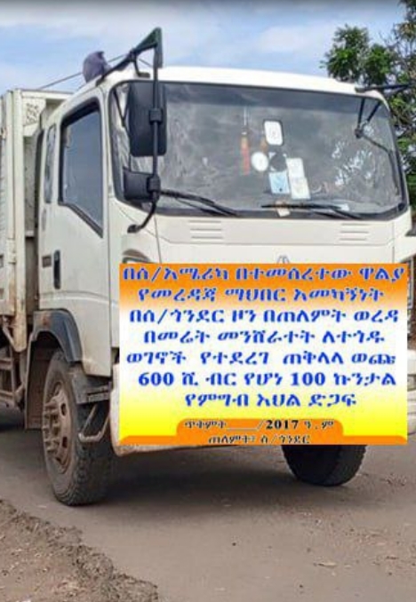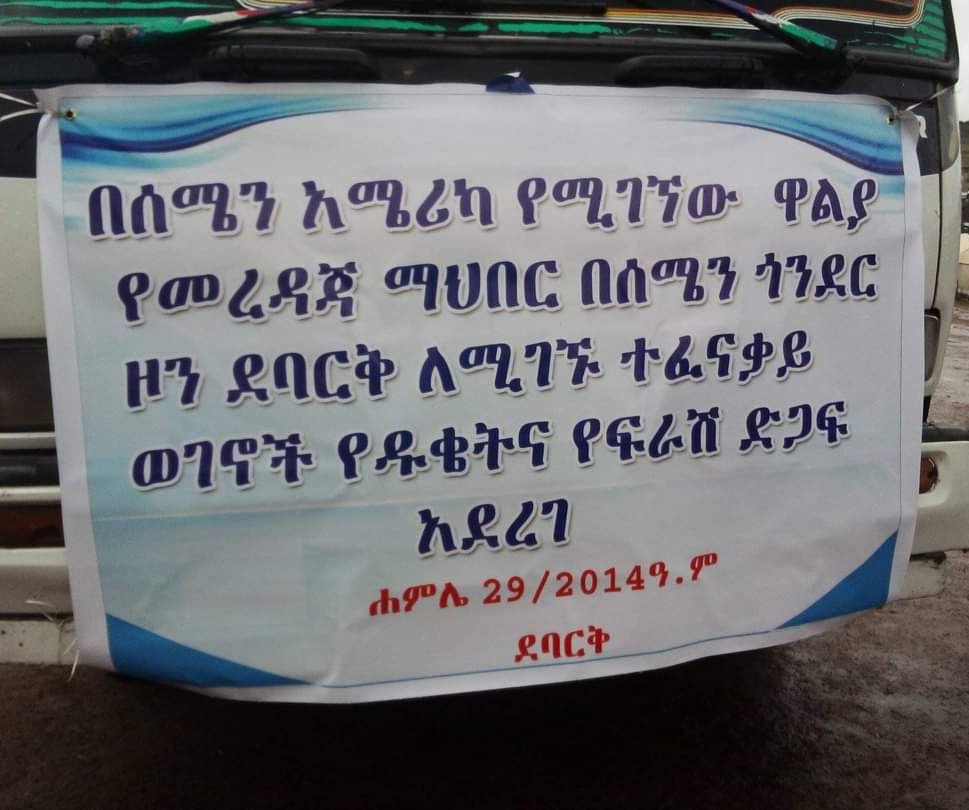 On July 29, 2022, the Government Communication Office of Adi Arkai District reported that the Walia Charity Society of North America donated essential supplies to displaced individuals in Debarak City, North Gondar Zone, Ethiopia. The donation, valued at 420,000 birr, included flour and mattresses.